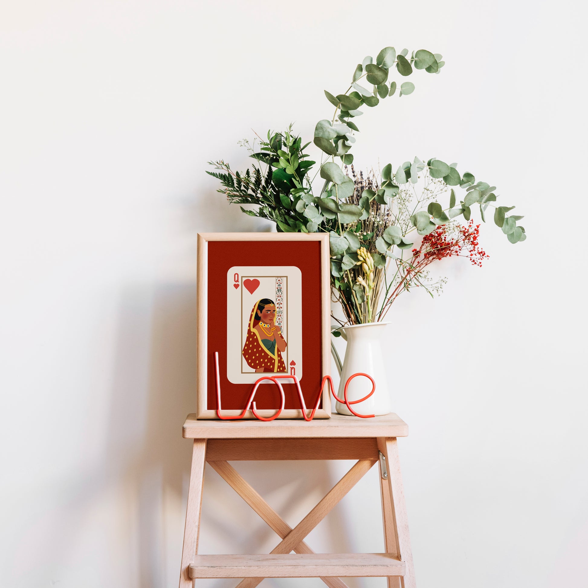 Portraying strength and elegance, The Queen of Hearts draws the eye with her commanding presence and thoughtful design elements. Whether displayed solo or paired with its counterpart, this print brings a touch of modern mystique to any wall.